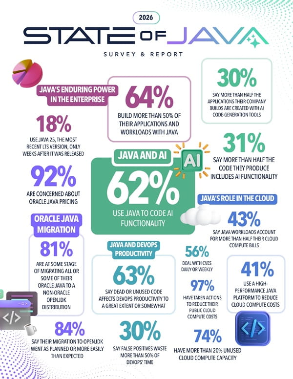 Beyond performance, cost pressure is reshaping Java strategy. The survey reports that 92 percent of respondents are concerned about Oracle Java pricing, and 81 percent are migrating or planning to migrate at least part of their Java estate to non-Oracle OpenJDK distributions.